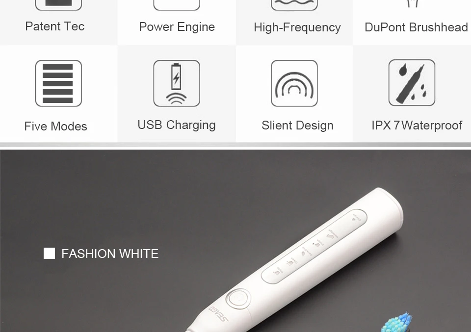 Белый: до 40000 раз/мин Можно отбеливать зубы, это режим глубокой очистки. Уход: подходит для эффективно устраняет остатки пищи, пятен и бактериальный налет. Чувствительность: деликатный режим обеспечивает эффект очистки. Между тем, это имеет эффект ухода за чувствительными зубами Польский: защита от короткого туда и обратно вибрации, этот режим поможет для удаления пятен и блеск зубов. Массаж: этот режим обладает функцией массажа, предоставляя вам более комфортным и мягким опыт чистки.