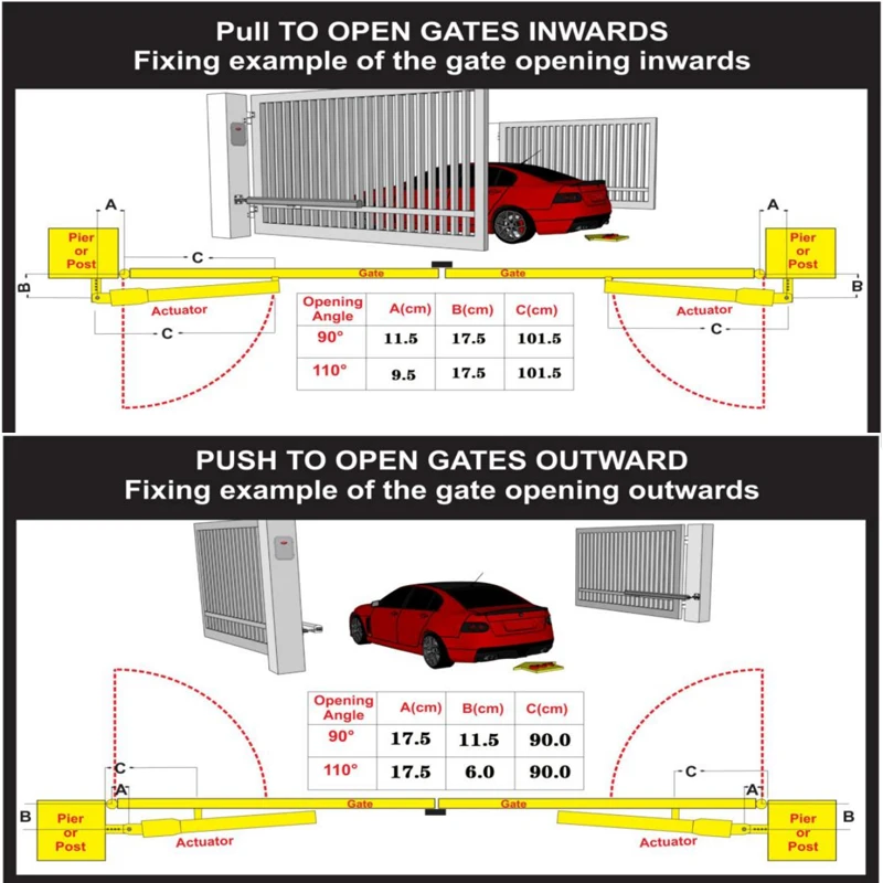 ① 2 * открывания ворот (приводной двигатель) ② 1 * блок управления (с трансформатором) ③ 1 * набор аппаратных аксессуаров ④ 1 * резиновая пробка ⑤ 2 * пульт дистанционного управления ⑥ 1 * руководство на английском языке Дополнительные аксессуары, выберите комплект цветов, показанный на фото В некоторых странах холодный климат, мы добавляем антифриз масло внутри двигателя, он может работать в холодной среде.
