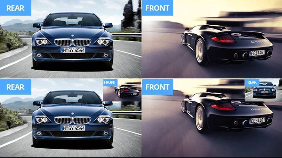 1:1 дизайн разделенного экрана для переключения передней и задней записи, большой экран и четко и ersily для проверки заднего вида. Сенсорный экран для переключения на фронтальную камеру, заднюю камеру.