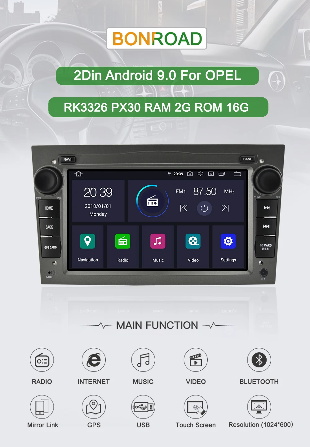 ОС Android 9,0 поддержка 3G/4G (опционально), WIFI, Bluetooth, вход камеры заднего вида, gps-навигация, AUX;USB, язык: английский, японский, немецкий, испанский, французский, португальский, итальянский и т. Д. Тип установки: din размер оборудования CPU: 4 ядра RAM: 2G ROM: 16G гладкий и быстрый реакционный экран, захватывающий и мультисенсорный экран, высокое разрешение, Радио Встроенный RDS Радиоприемник, функция радиочастотной области: Fm87,5-108 МГц; AM522-1620KHz мультимедийные параметры Формат музыки: MP3,WMA,AAC,RM,LFAC Fomat: JPG,BMP,JEPG,GIF,PNG совместимый диск: MP4,MP3,MP2