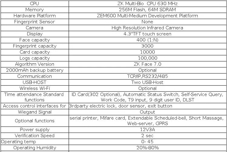 IFace702 мульти-Биометрическая идентификация посещаемости времени и контроля доступа терминал принимает ACEBON программного обеспечения последней платформы ZEM600 с ROR Face 7,0 алгоритм и большой емкости памяти. IFace серия integrated 630 МГц высокоскоростной мультибио-процессор ROR и инфракрасная камера высокой четкости обеспечивают идентификацию пользователя в темной среде. Мультибиометрический метод идентификации лица и отпечатков пальцев будет применяться более широко. Все операции iFace созданы для того, чтобы быть выполнена на 4,3 дюймов TFT сенсорный экран. Мультимодельные коммуникации включают RS232/485, TCP/IP, дополнительный WiFi или GPRS. Дополнительный встроенный аккумулятор 2000 мАч устраняет проблемы с отключением питания.