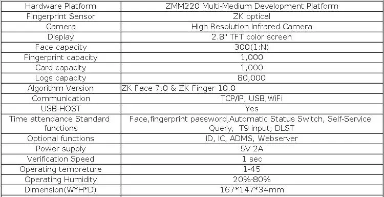 UF100Plus мульти-Биометрическая идентификация посещаемость времени принимает zk программного обеспечения последней ZMM220 платформы с zk лицо 7,0 алгоритм и 300 пользователей объем памяти. Первое устройство zk face с клавиатурой. Мультибиометрический метод идентификации лица, отпечатков пальцев и паролей будет применяться более широко. Все операции UF серьезные созданы для того, чтобы быть выполнена на 2,8 дюймов TFT экран. Мультимодельные коммуникации включают TCP/IP USB, функция Wi-Fi позволяет u-диску загружать отчет о посещаемости напрямую.