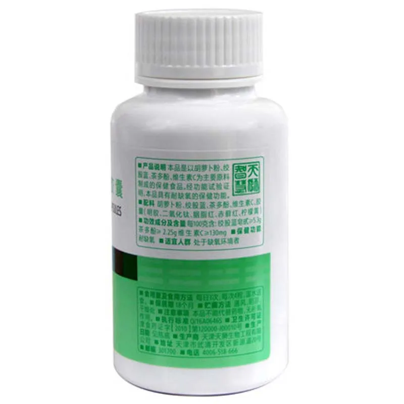 Описание продукта: Этот продукт изготовлен из морковного порошка, гиншеммы пентафилла, чайных полифенолов, витамина С в качестве основного сырьяСостав и содержание: на 100g: экстракт пятиядерный ГП ≥ 5,3 г, чай полифенолы ≥ 2,25 г, витамин C ≥ 130 мгФункция здравоохранения: анти-гипоксияПодходит для людей: тех, кто находится в условиях нехватки кислородаПотребление и использование: 3 раза в день, 4 капсулы каждый раз, теплая водаПримечание: Этот продукт не может заменить препарат, без кислорода.