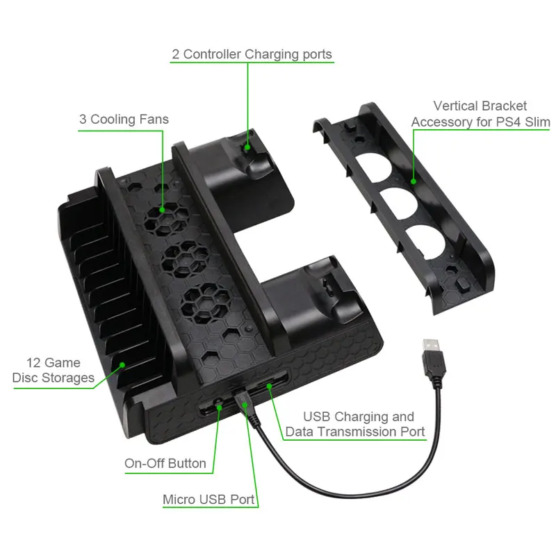 Our universal PS4 console dual charging station with two charger ports simultaneously charges your PS4 controller, saving you time! The vertical bracket fan cooler allows your PS4/PS4 pro/PS4 slim to be effectively cooled. One HUB and one USB port are designed with powerful charging outputs for great performance improvements. This PS4 accessory is your best choice!