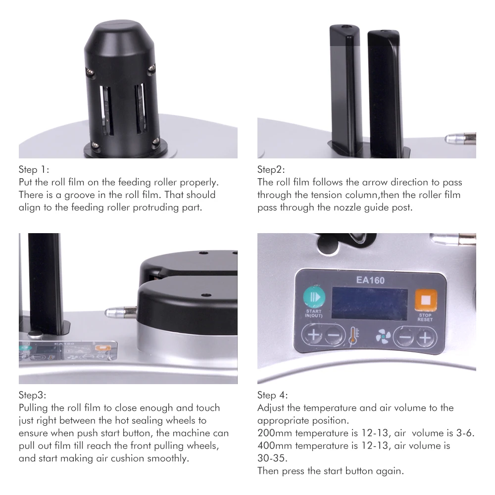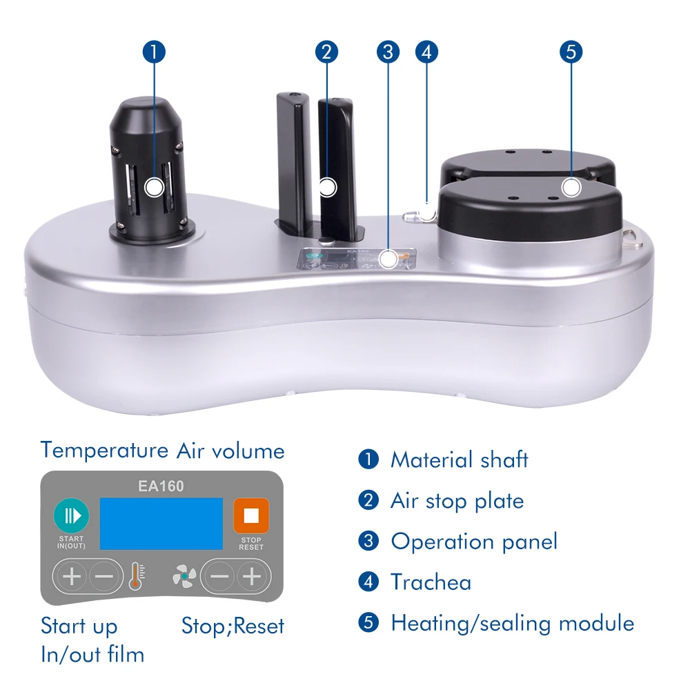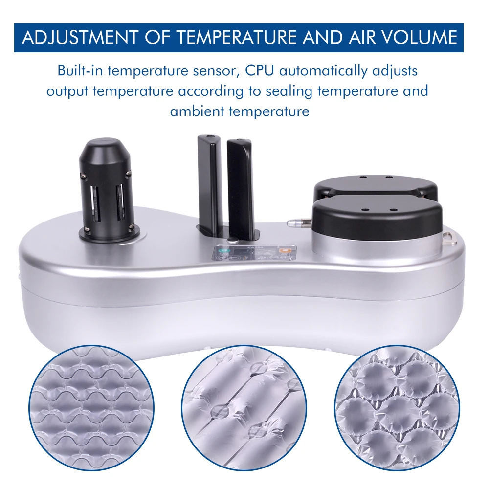 2. Мощность машины воздушной подушки: 100 Вт подходит для 100-240 В/50 Гц-60 Гц около 12 м/мин, низкое энергопотребление, использование того же адаптера питания, что и ноутбук, безопаснее, более энергосберегающее, быстрое и равномерное, автоматическое Надувное уплотнение.