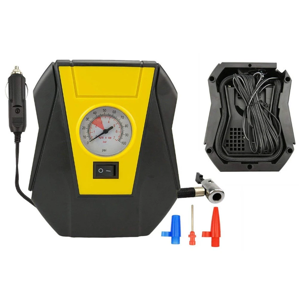 About Product (FAST AND POWERFUL)This portable air pump can inflate standard medium vehicle tires from 0-35 PSI in 5 minutes.And its maximum pressure is100 psi. Heavy duty compact design and high quality material will make it have Long service life (Multi-Purpose The air pump includes three high airflow nozzles and adapters that make it easy to use for varies tires. You need not worry about finding an external power supply.Compatible with almost all kinds of car tires( Attention: not applicable for heavy duty truck large commercial-grade vans ).It can be used for inflatable cars,SUV,motorcycles,bicycles,RV,and ATV tires, as well as sports equipment and inflatable toys (Simple to useThe three reading unit makes reading pressure easier and more convenient, which means we can better control the pressure to ensure safety while inflating tires (LONG CHARGINGING CABLEThe length of the cable is 12 feet( 3m ),which can absolutely extend to any one of the four wheels or even further easier.Never to use an air compressor that can not reach back tires Safety and durable The air compressor'protector box is made of ABS plastic and the movement is made of Aluminum alloy.Pass multiple repeated safety testing.With high-speed cooling to ensure the life of the movement. Convenient And Portable The inflatable tube and power wires is easy to store. You need not worry about the accessories may mess up after using.Easy to carry and it will become your emergency helper. 3M Long Power Cord It can be easily connected to front and rear tires. Low Noise Motor Tire inflator is applied special motor technology to achieve low noise. So you won't be upset when inflating. Specification Trade Name: car air pump Product power:90W Input voltage: DC12V Inflation time: 8-9 minutes Size: 16.5x8.5x14cm Inflatable and portable,easy to carry. Less than 60db,ultra-quiet Stable,air flow ratereaches 25L/min Durable,high-speed heat dissipation,guarantees the life of the movement Safe and precise Easy to storage and convenient 3m,front and rear wheels can be inflated. Net Weight: 0.5kg colour:Black + yellow Material:ABS Package Contents 1 * Air Compressor 3 * Nozzle Adapters Only the above package content, other products are not included. Note: Light shooting and different displays may cause the color of the item in the picture a little different from the real thing. The measurement allowed error is +/- 1-3cm. recommend