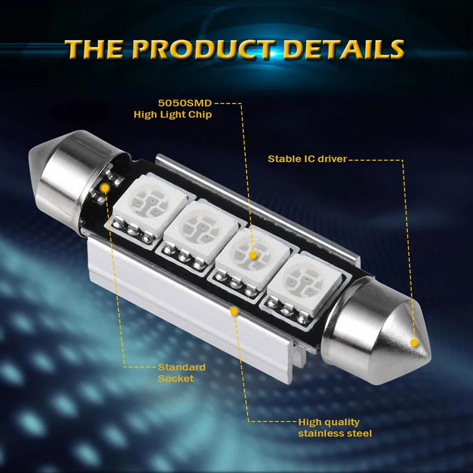 В наличии Напряжение: DC9V ~ 16В Цветовая температура: 7000-8000k Тип изделия: C5W C10W светодиодный гирлянда Тип SMD: 4 шт. 5050SMD Размер (длина): 41 мм, 42 мм Световой поток: 120Lm Замена: C5W C10W светодиодные лампы canbus Использование: светильник для чтения, купольный светильник, светильник карты, сигнальный светильник и т. д.