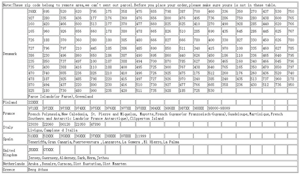 Примечание: Эти почтовые индекс относятся к удаленной области, мы не можем выслать pracel.