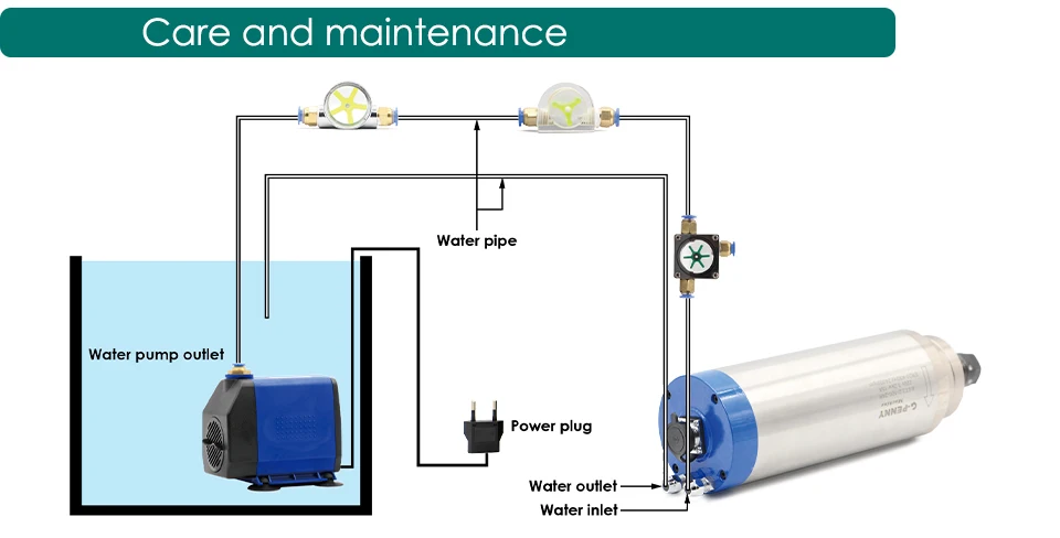 Перед использованием шпинделя с водяным охлаждением система охлаждения работает должным образом. Каждый день перед использованием шпинделя должен работать на низкой скорости в течение 15-20 минут. Прижимная фрезы к шпинделю, коллетным газам, коллетам, резакам должна быть достаточно чистой. Хвостовик, вставленный в Коллет, должен быть больше 15 мм