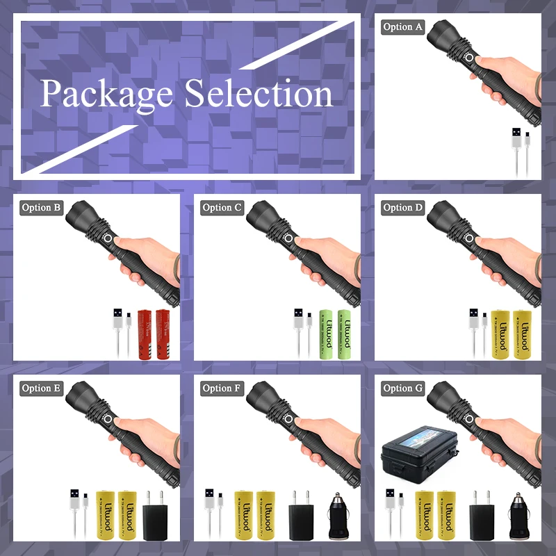 Вариант G1 *Фонарик + 1 * Micro USB +2*26650 желтые батареи+ 1 * штекер + 1 * Автомобильное зарядное устройство + 1 * коробка