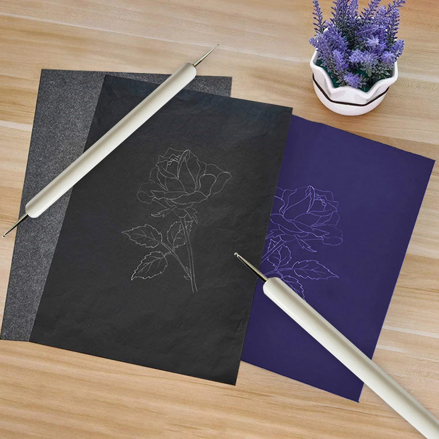 Включая 100 Листов Углеродистой бумаги, 5 шт. различных размеров тиснения стилуса и 50 листов кальки бумаги.