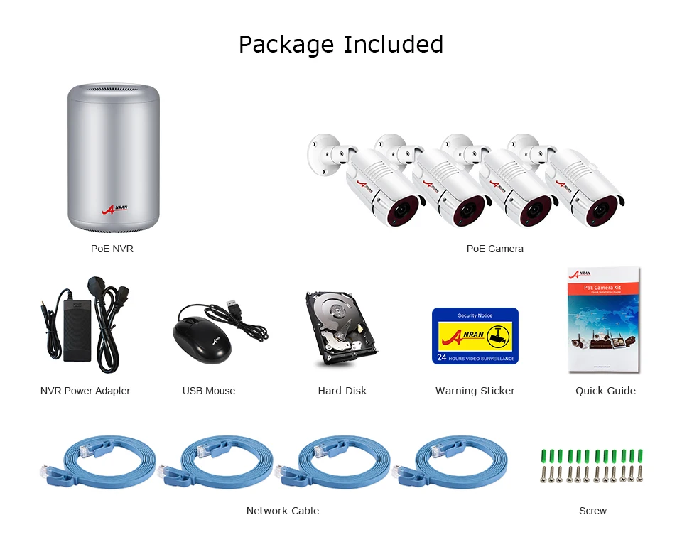 1 х 4CH POE NVR 1 ТБ, 2 ТБ или 3 ТБ HDD (зависит от свойств продукта, который вы выбираете) 1 х Сетевой адаптер питания 1 х USB мышь 1 X Краткое руководство 4 камеры Bullet (белый или черный на выбор) 4 X сетевой кабель 4 винта для упаковки Предупреждение ющая наклейка (подарок)