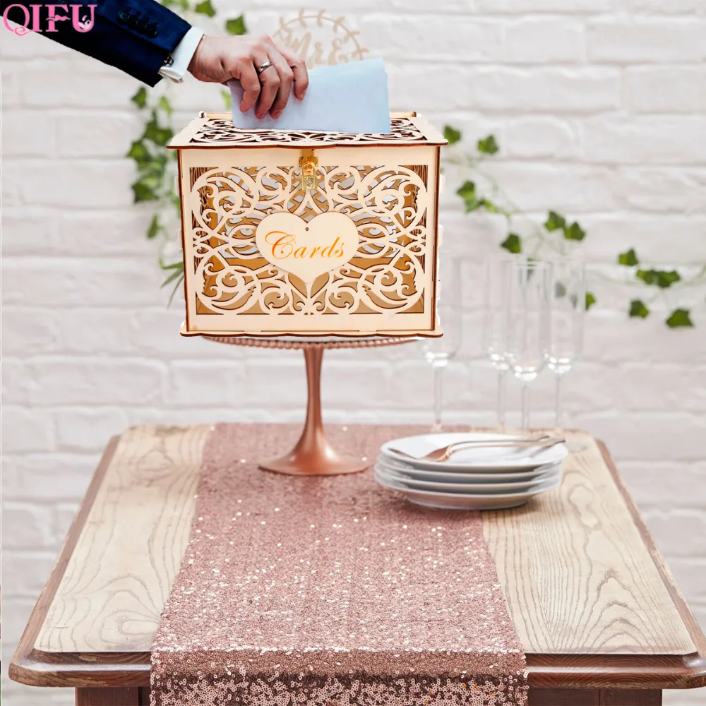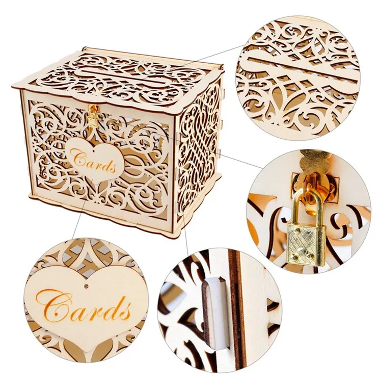 Цвет: натуральный Размер: Размер коробки: Длина прибл. : 12,2 " (30 см) Ширина прибл. : 9,5 " (24 см) Высота приблизительно. : 8,2 "(21,5 см) Размер отверстия прибл. : 8,2 "x 0,4" (210x10 мм) Материал: дерево Вес: 420 г (без упаковочной коробки) Применение: уникальная коробка для свадебных карт с замком-Отличное дополнение к вашему свадебному украшению.