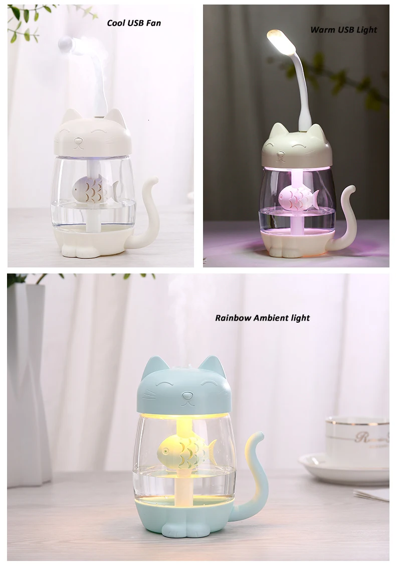 Материал: АБС + ПП + силиконРезервуар для воды: 350 млРазмер: 83*107*136 ммЦвет: синий, розовый, белый, фиолетовыйМощность: 1,5-2 ВтНапряжение: 5 В постоянного токаОсобенность:1. Романтический светодиодный светильник радужного цвета2. Увлажнитель воздуха с таймером на 4 часаУвлажнитель воздуха 3,3 В 1, USB-вентилятор светодиодный светильник ка4, изысканный дизайн в виде кошки и рыбы, большая емкость может работать до 8-10 часов5, Сильный туман с ультра-совершенным дизайномСпособы подключения:1. Зарядное устройство для телефона2. Внешний аккумулятор3. USB-порт для ноутбукаПосылка включает:1. Увлажнитель * 12.USB-кабель * 13. Руководство * 1