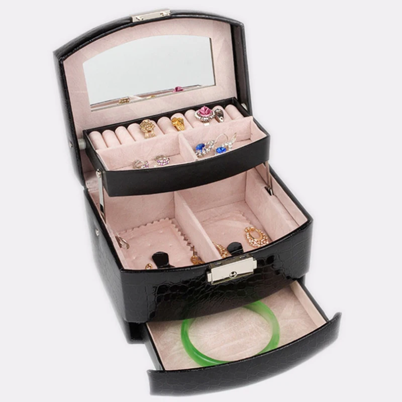 Эта коробка с крокодиловым узором, автоматическая коробка для ювелирных изделий, трехслойный чехол для хранения с косметическим зеркалом