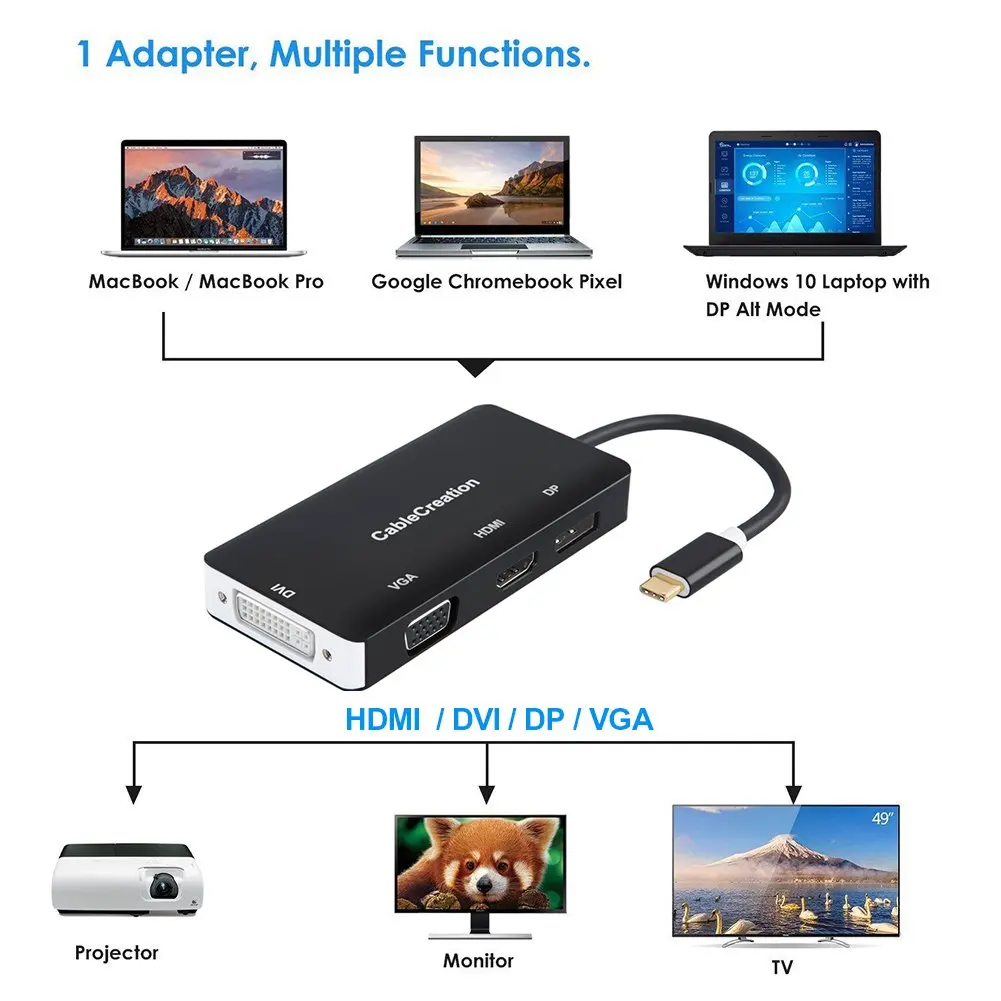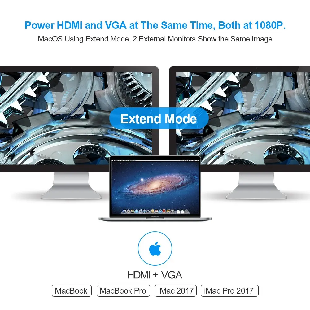 1. Совместим только с USB-C ноутбуками, которые с режимом DP Alt или Thunderbolt 3, не совместимы со всеми ноутбуками Asus. 2. HDMI + VGA работает вместе, сначала Подключите порт HDMI к монитору с поддержкой HDMI-> Настройте Разрешение монитора на 1080P-> Подключите порт VGA с монитором с поддержкой VGA-> Настройте Разрешение монитора на 1080P. Любое разрешение монитора не может быть выше 1080P. 3. MacOS в режиме расширения, оба внешних монитора показывают одно и то же изображение. 4. Для пользователей Yoga 910, Пожалуйста, подключите адаптер только в белый USB-C женский порт. 5. Этот товар не совместим со старым монитором DVI, таким как Apple Cinema HD Display (30-дюймовый DVI), и этот элемент является одноканальным DVI, не будет поддерживать DVI с двумя звеньями. 6. Если у вас есть какие-либо проблемы, пожалуйста, свяжитесь с нами.