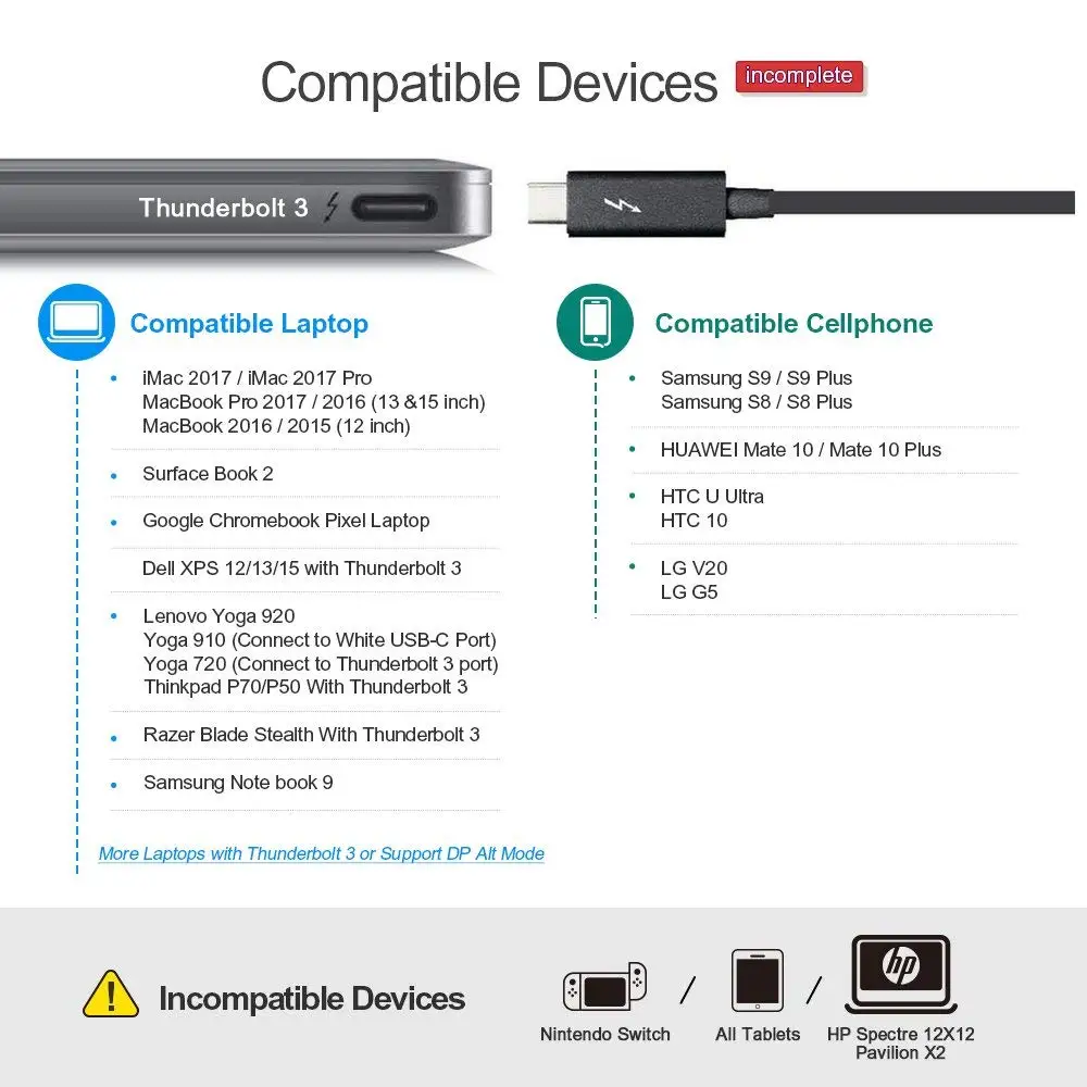 * IMac 2017 * Новый MacBook Pro 2017 & 2016 * Новый MacBook 2015 * Новый Chromebook Pixel * Dell XPS 12 и 13 и 15 * Йога 920 * Yoga 910 (пожалуйста, всегда Подключайтесь к порту белого USB-C) * Йога 900 (Йога 4 Pro) * HP Spectre X360 с портами Thunderbolt 3 * Книга поверхности 2