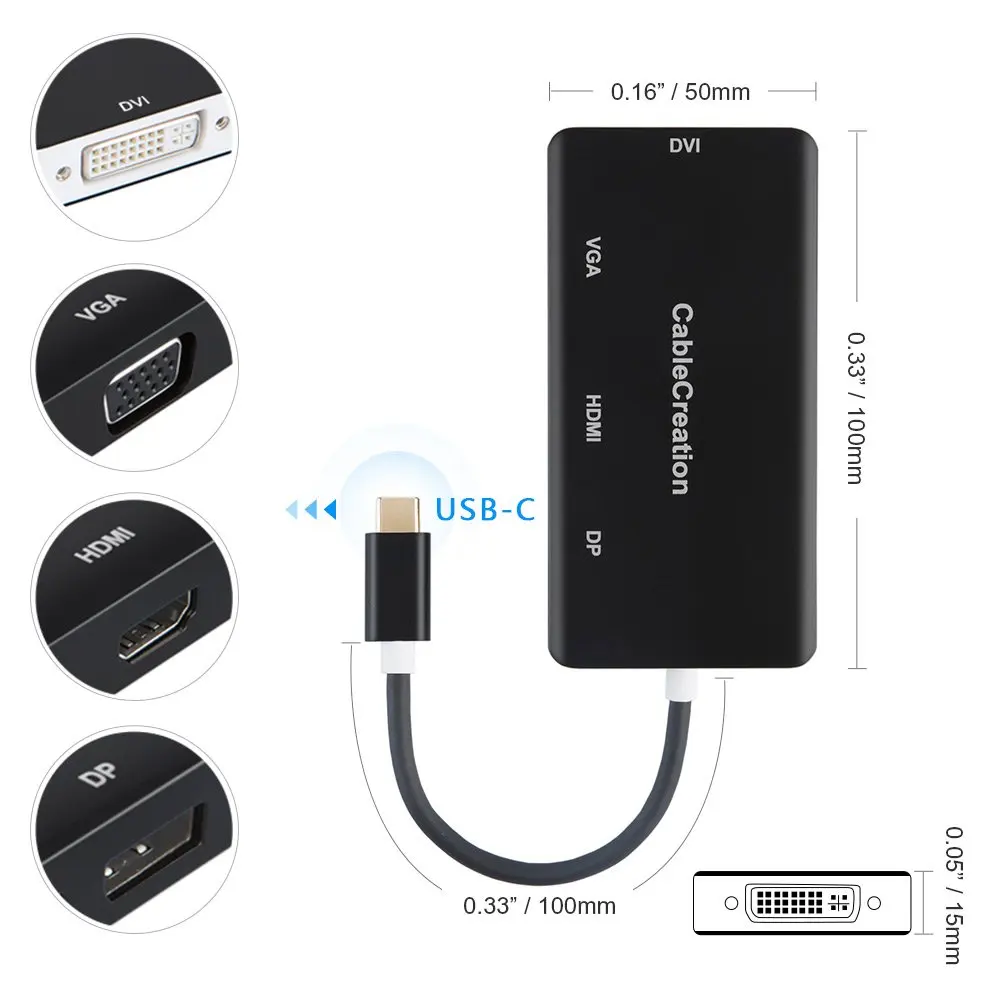 -Сторона 1 (вход): * USB-C Type C Male x 1 -Сторона 2 (выход): * HDMI 4K x 2K @ 30Hz Female x 1 * DP 4K x 2K @ 30Hz Female x 1 * VGA 1920x1080 @ 60 Гц женский x 1 * DVI 1920x1080 @ 60Hz Female x 1 Цвет: черный Длина кабеля: 10 см