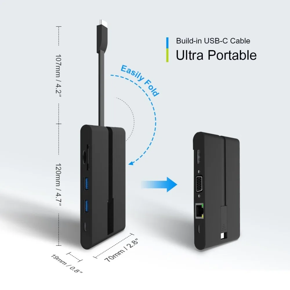 ▶ USB-C Multifunctional Hub with Build-in USB-C Cable, Ultra Portable and Practical. USB 3.1 Type C to HDMI 4K + VGA + USB 3.0 + Gigabit Ethernet + Card Reader + USB-C PD Charging Dock, Compatible with Thunderbolt 3 Laptop or USB-C Laptop Support DP Alt Mode, iMac 2017, Macbook Pro 2017 & 2016, Macbook 2016 & 2015, Google Chromebook Pixel, Dell XPS 13 & 15, HP Spectre x360 13" & 15", Lenovo Yoga 900 & 910 & 920, ThinkPad P50 & P70, Surface Book 2.