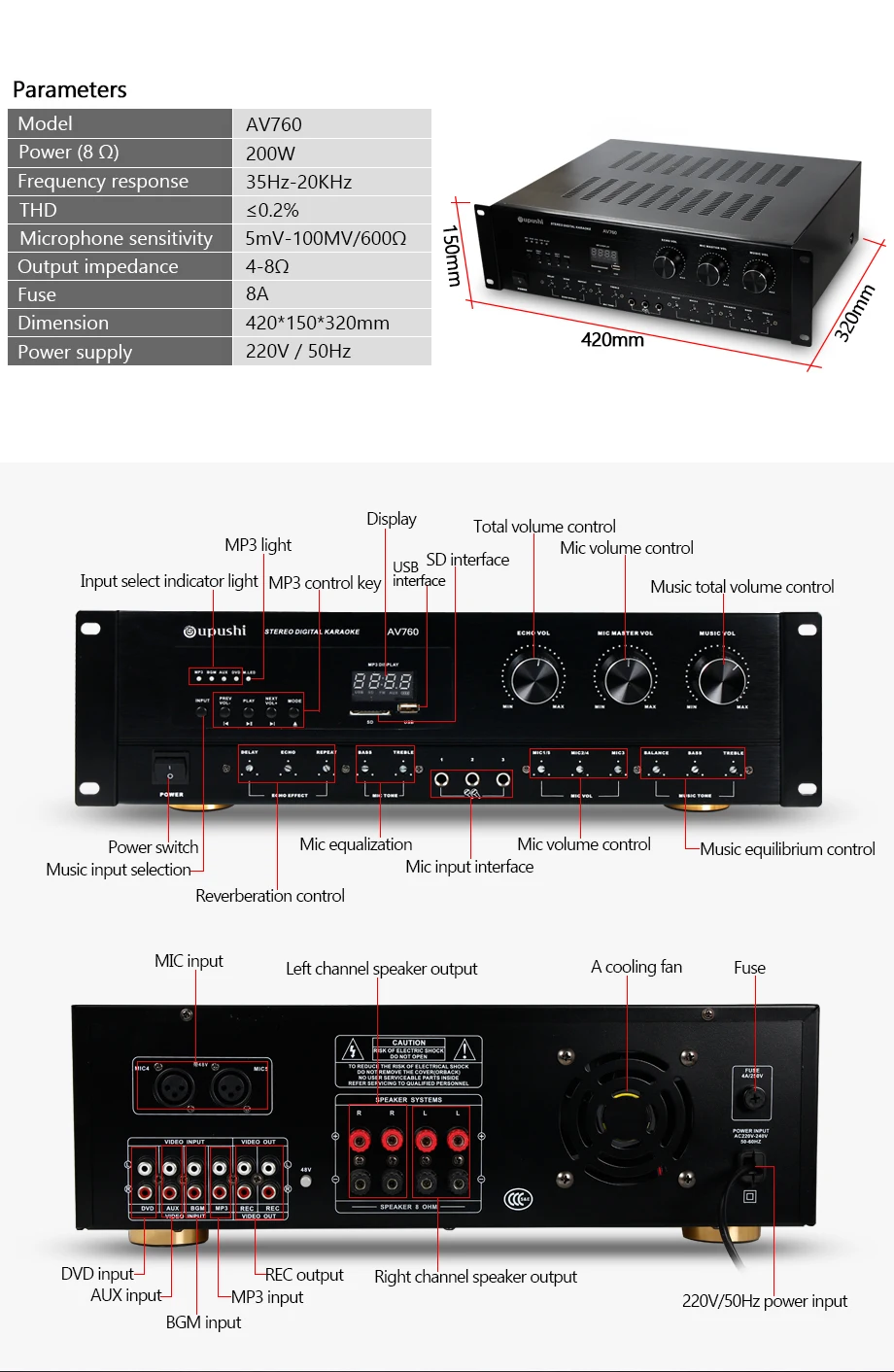 Домашний кинотеатр Oupush, семейная система караоке, Профессиональный усилитель мощности, большие колонки, беспроводной ручной микрофон UHF