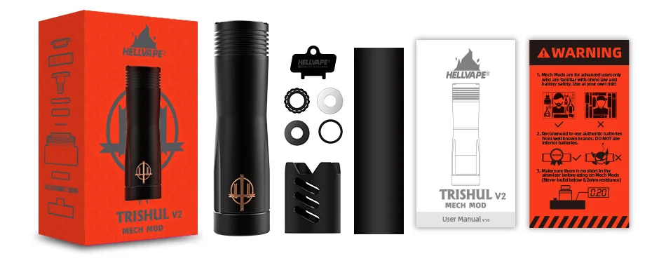 1 X Trishul v2 мех мод 1 х черный магнит 1 х уплотнительное кольцо 1 изолятор 1 X Предупреждение карты 1 X адаптер аккумулятора 18650 1 X силиконовая прокладка 1 х металлическая прокладка 1 X Руководство пользователя 1 х пластиковый ключ Простая упаковка. Обычная упаковка с завода, упаковка может быть изменена без уведомления.