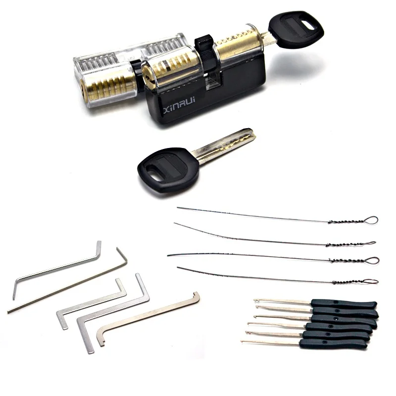 Lock Pick Set Lock Material:Acrylic and Alloy and Brass Core Padlock Size:79 x 50 x 24mm Type 1 Lock Size:65 x 34x 20mm Type 1 Lock Size:65 x 34x 20mm Hand Tool Set:5pcs key extractor +10pcs wrench tension tool