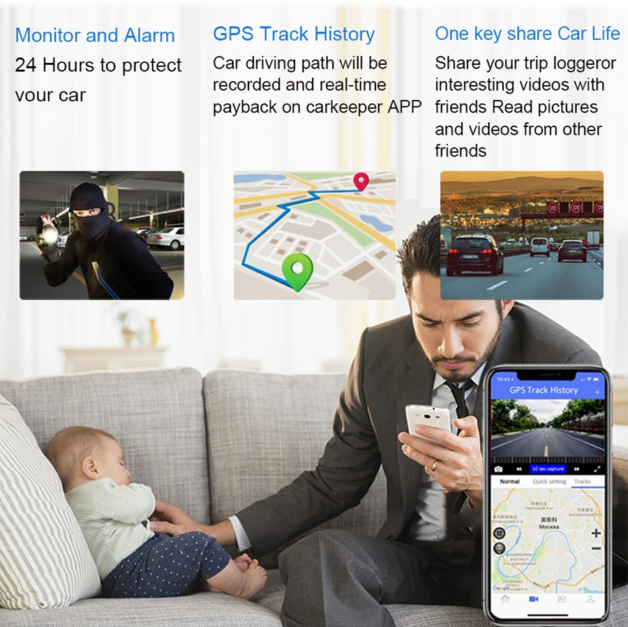 Когда кто-то рядом с вашим автомобилем или автомобилем начинает двигаться, автоматически включается и начинает запись при обнаружении любого удара или столкновения, устройство автоматически записывает в течение нескольких секунд, убедитесь, что 24 часа охраны парковки.Посылка включает провод OBD Buck