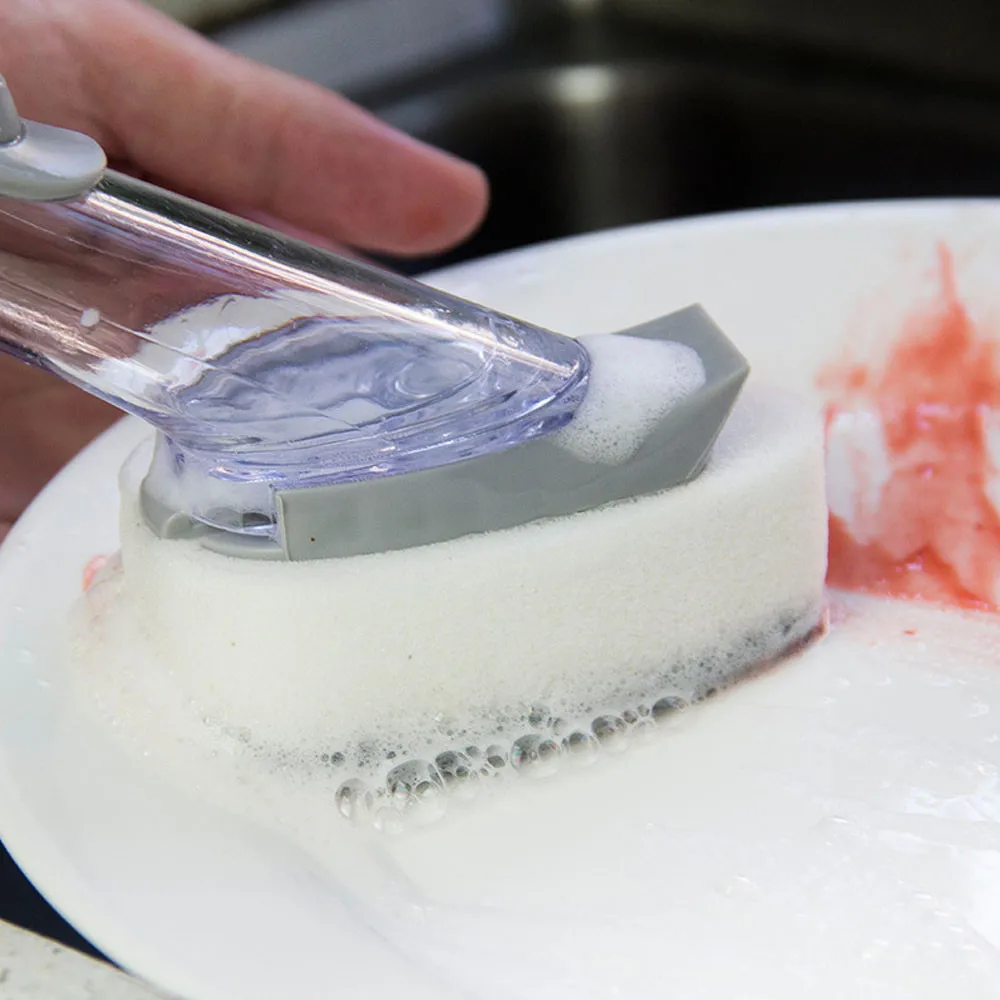 Силиконовая кнопка на ручке, чтобы выпустить жидкость для мытья, чтобы смыть упрямую смазку и грязь.