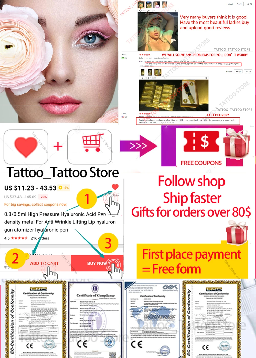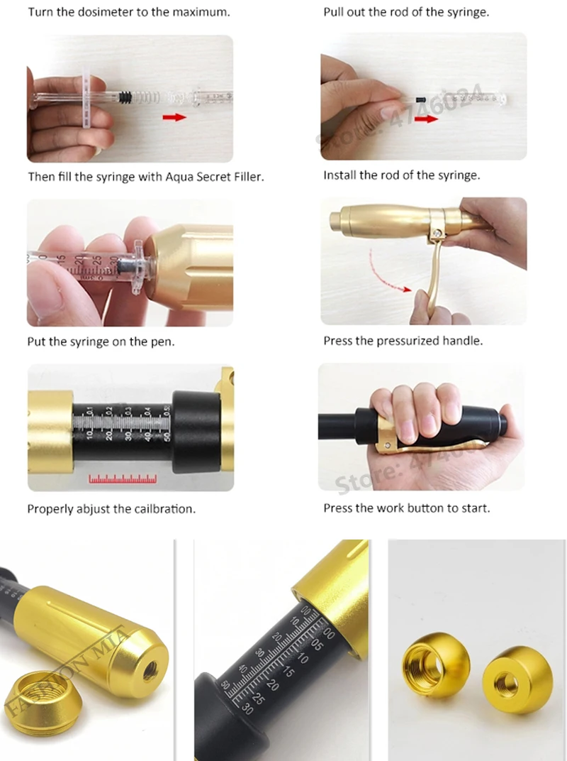 Разные стили имеют различную глубину впрыска, чем больше глубина является новым обновленным стилем. Это хорошо для использования, лучший эффект. Описание продукта: Тип 1: 2 в 1 ручка с гиалуроновой кислотой Тип 2: двухголовная гиалуроновая ручка Особенности: удаление кровеносных сосудов, омоложение кожи, темные круги, удаление морщин, потеря веса, увлажняющий крем, отбеливание, увлажняющий крем Материал: 316 нержавеющая сталь (Профессиональная Медицинская нержавеющая сталь) Объем впрыска: 0,3-0,5 мл Режим работы: распыление высокого давления Глубина впрыска: 6-15 мм Принцип работы: Пружина и поршень, которые позволяют под давлением быстро и равномерно вводить препараты под кожу через отверстие диаметром 0,1 мм, что в два раза меньше толщины иглы для инъекций! С помощью энергии механического действия пружина и специальный поршень в аппарате позволяют под давлением быстро, но аккуратно проталкивать поток лекарств через Микроскопическое отверстие в подкожной ткани. Препараты усваиваются гораздо лучше и быстрее, чем с введением иглы, что было подтверждено в серии исследований и тестов, проводящихся в разных странах мира. Идеальное решение для тех, кто подвержен рубцам и подкожным сгусткам. Преимущества ручки Hyaluron: * Не вызывает болезненных ощущений впрыска топлива * Инъекция без иглы устраняет риск инфекции от иглы * Не оставляет шрамов и проколов на ткани кожи с помощью иглы * Лучшее и быстрое поглощение лекарств * Строго Подкожная инъекция-устраняет риск проникновения препарата в мышцу * Быстро, легко и безопасно * Раздельное и экономичное дозирование препарата Примечание: Если вы не могли раньше использовать гиалуроновые наполнители (или другие косметические средства), вам не лучше обратиться к косметологу.
