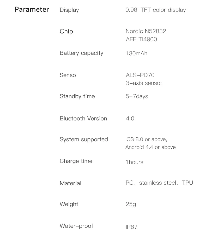 1. Принцип измерения Носимых устройств полностью отличается от принципа измерения медицинского оборудования. Это только для занятий спортом и фитнесом, спасибо. 2. Заряжайте в течение 3 часов при первом использовании. 3. Пожалуйста, загрузите приложение перед использованием.