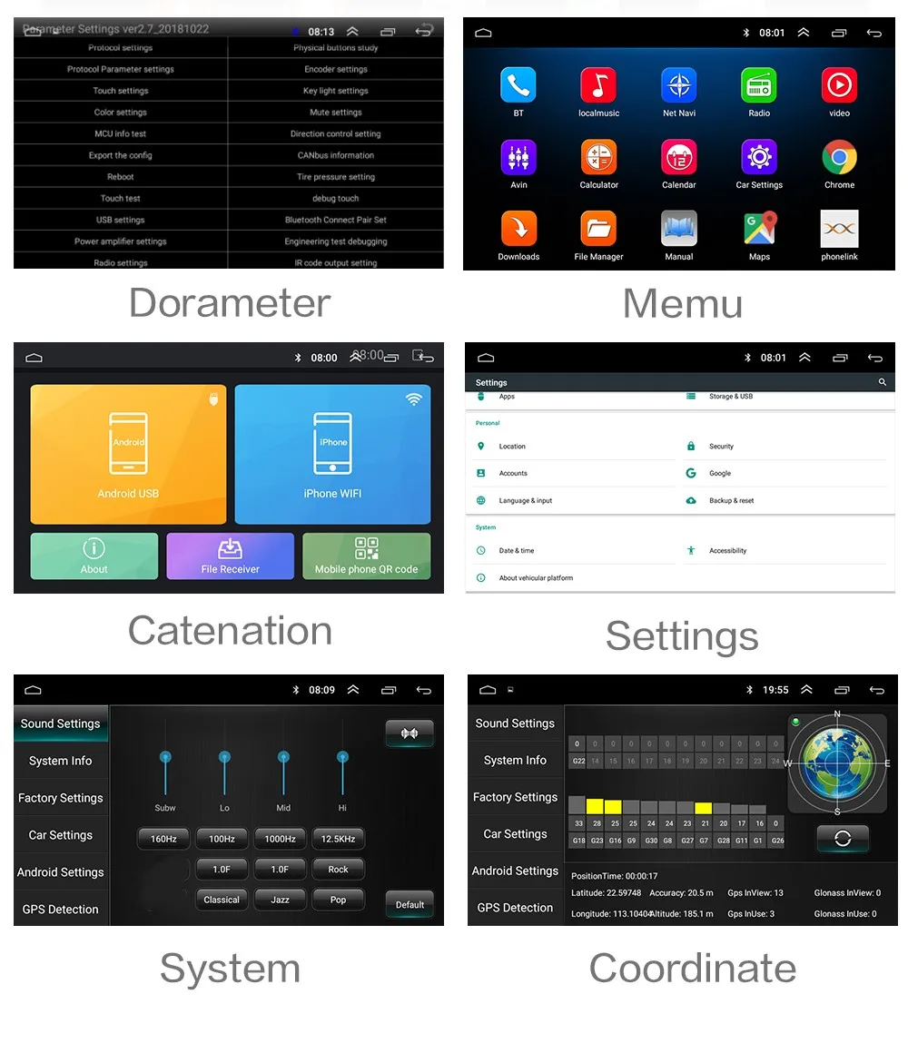 1, Операционная система Android 8,1 Можно установить приложение Google Play store Skype Facebook youTube Twitter и т. Д. 2, четырехъядерный процессор MTK8227 / Cortex-A7 RAM + ROM: 1G + 16G / 2G + 32G Система, которая занимает внутреннюю операционную систему памяти, занимает около 4-6 ГБ памяти 3. На экране представлены различные Языки меню: китайский (упрощенный), китайский традиционный, русский, испанский, турецкий, иврит, арабский, французский, немецкий, португальский, корейский тайский 48, И т. д. 4, поддержка автомобиля logo5, (поддержка нескольких наушников) RDS не поддерживается 5.Pantalla capacitiva HD 2.5D, resolución: 1024*600, совместимый con reproducción de 1080 p + Musica sin pérdidas Soporte OBD (опционально) Soporte DAB + (опционально) 6.Processador de som: AC7315HX