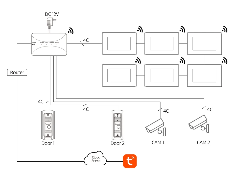 It can convert your 4-Wired Analog Video Door Phone system to IP Wifi Video Intercom System, after converted, the IP intercom system will support "TuyaSmart" APP, support remote unlock, monitor the door from smart phone.