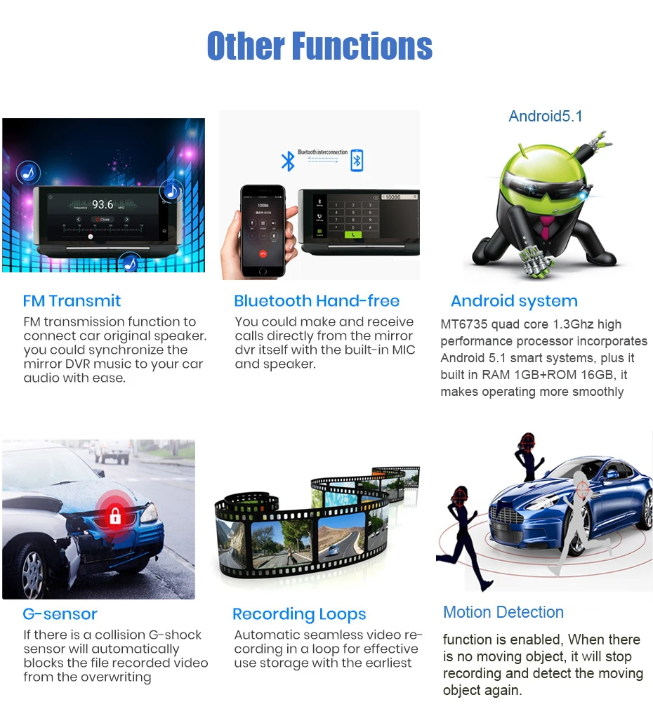 GPS навигация, Автомобильный видеорегистратор, монитор парковки, Bluetooth hands-free, WiFi, fm-передатчик, смарт-устройство с ОС Android 5,1, ADAS,4G интернет-серфинга, удаленный монитор, g-сенсор.