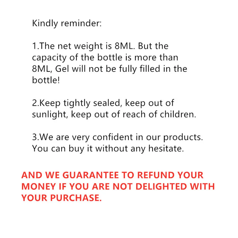 -Качество-наш первый приоритет. -Светильник, почти без запаха (только верхнее покрытие и основа имеют умеренный запах), мы применяем только органическую текстуру для защиты вашего здоровья. -Цвет будет сиять до 30 дней. -Цвета на выбор, подходят для всех случаев. Шаг за шагом: -1. Форма ногтя. Слегка смочите поверхность ногтевой пластины. Дезинфицировать. -2. Нанесите тонкое покрытие основы от кутикулы до свободного края (не забудьте запечатать край ногтя). Высушите ногти под светодиодный светильник в течение 10 секунд или УФ-светильник в течение 2 минут. -3. Нанесите тонкое пальто отмачиваемого геля на выбор. Свободный край крышки. Лечение: 30 секунд в светодиодный светильник, или 2 минуты в УФ-лампе. -4. Повторите 2-е тонкое покрытие отмачиваемого гель-лака на ногти. Высушите под светодиодный лампой в течение 30 секунд или УФ-светильник в течение 2 минут. -5. Нанесите тонкое пальто сверху. Свободный край крышки. Лечение: 30 секунд в светодиодный светильник. -6. Удалите липкий остаток на ногтях с помощью очищающего средства. Затем нанесите питающее масло кутикулы для увлажнения влаги в кутикулу и кожу вокруг ногтя. Для удаления: -1. Замочите ногти в акриловое средство для удаления около 5 минут, -2. Аккуратно Наденьте на каждый ноготь всю эмаль для ногтей. Посылка: Вес нетто: 8 мл Вес изделия: 30 г Вес посылка: 40 г Если у вас есть другие вопросы, пожалуйста, свяжитесь с нами. Allneweluk всегда предоставит вам лучший сервис и продукт.