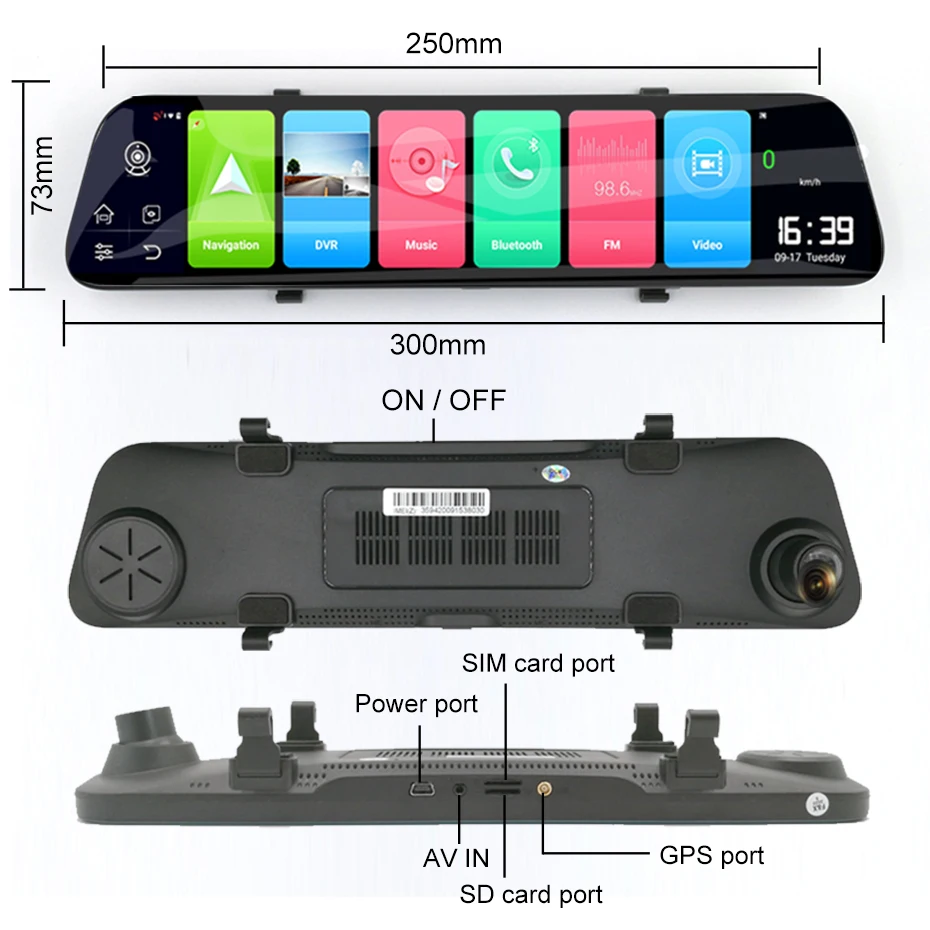 GPS-навигация, Автомобильный видеорегистратор, парковочный монитор, Bluetooth hands-free, Wi-Fi , FM-передатчик, умное устройство с ОС Android 8,1, ADAS, Интернет-серфинг 4G, удаленный монитор, G-сенсор.