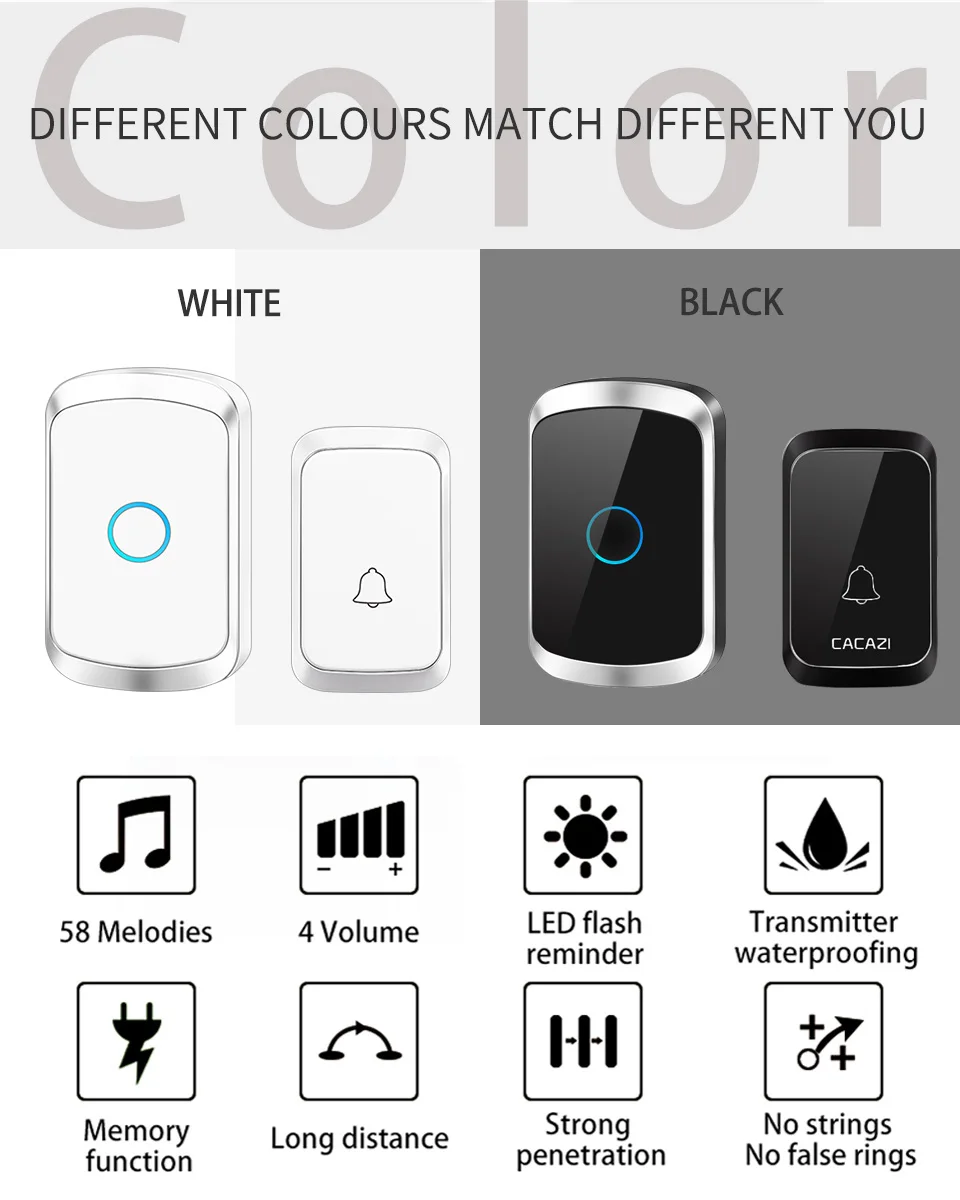 Если вам нужно изменить музыку, выполните следующие действия: 1. Сначала Выберите музыку, которую вы хотите использовать. 2. Нажмите и удерживайте музыкальную кнопку приемника, и вы услышите, как приемник издает звук «dong» ahd flash. 3. Нажмите на передатчик дважды, и приемник зазвонит снова, и музыка успешно сочетается.