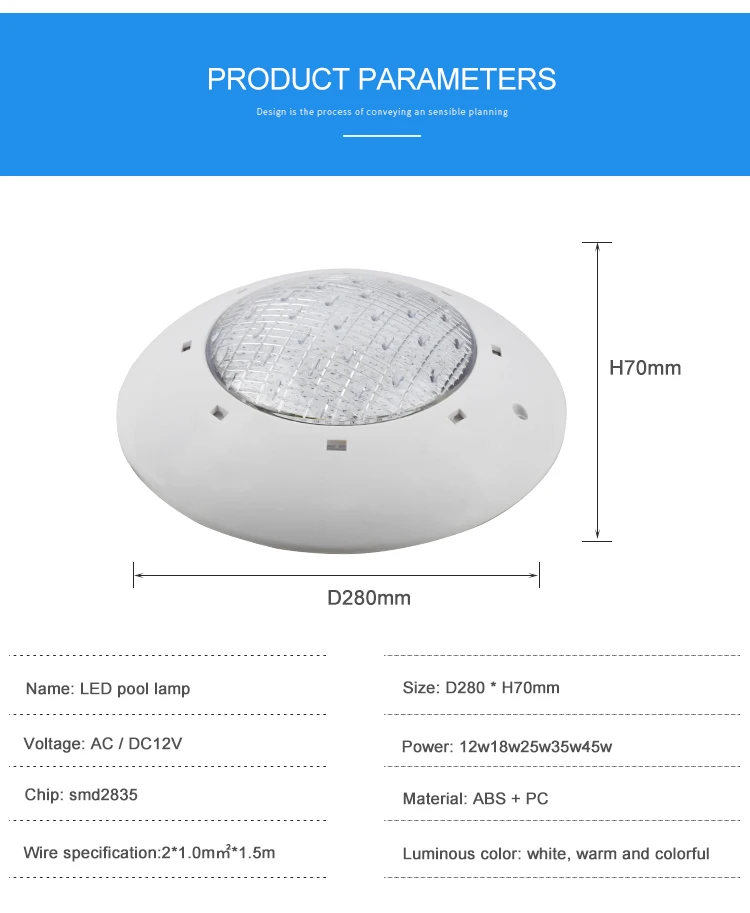 Входное напряжение (В):AC/DC12V Мощность лампы (Вт):18/25/35 Световой поток лампы (лм):2500 CRI (Ra>):85 Рабочая температура (℃):20 - 45 Срок службы (час):50000 Ip-рейтинг: IP68 Сертификация: CE, FCC, RoHS Материал корпуса лампы: АБС-пластик Гарантия: 2 года Цвет СВЕТОДИОДА: WW/W/R/G/B/Y/RGB Угол луча: 15/30/45/60 Светодиодный Цвет: WW/W/R/G/B/Y/RGB3 Материал: АБС-пластик + Поликарбонат Один посылка Размер: 31X31X12 см Один вес брутто: 1,300 кг