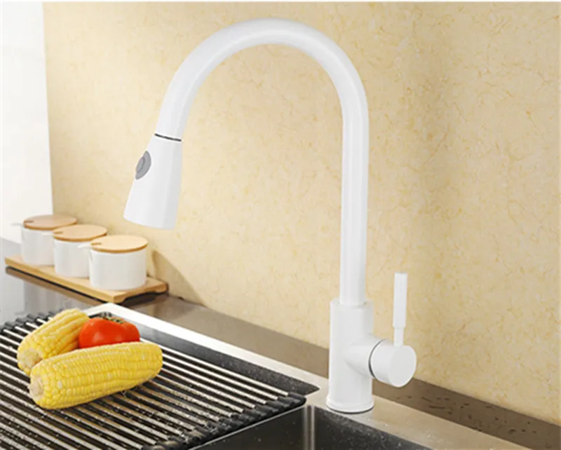Кухонный кран смеситель выдвижной кухонный кран с одной ручкой одно отверстие Поворот на 360 градусов медный Белый/никель/золото поворотный смеситель для раковины