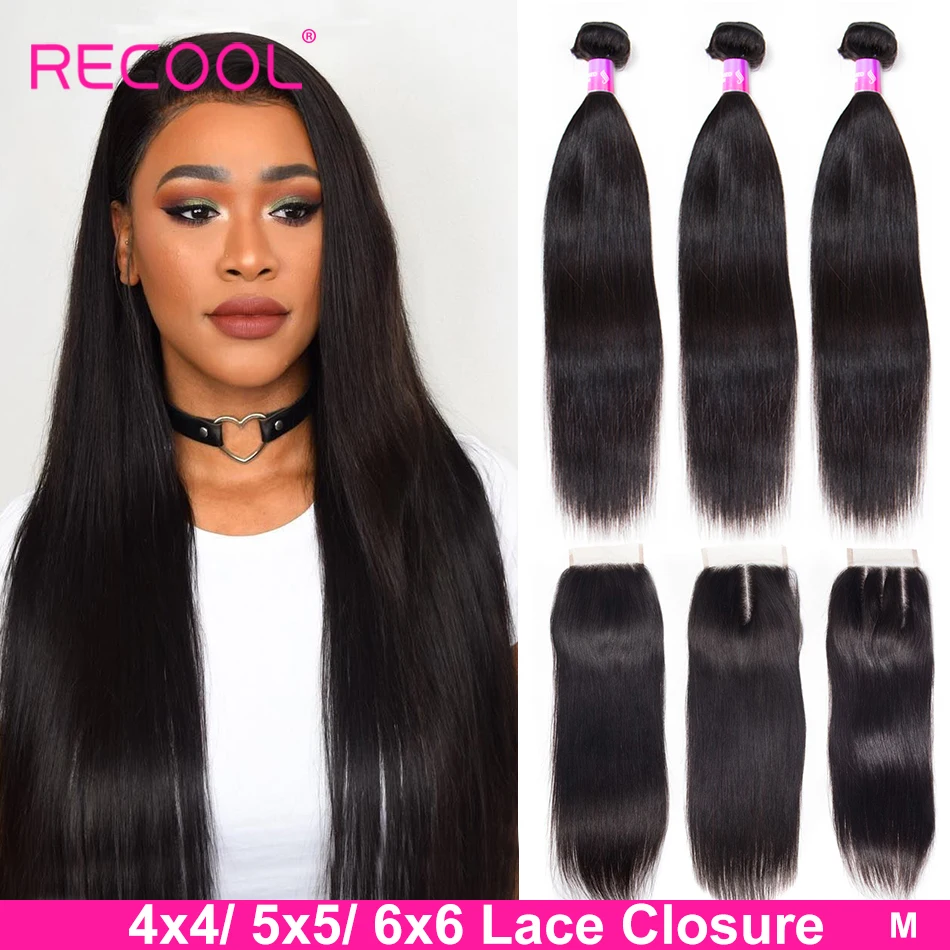 Recool прямые пряди волос с закрытием 5x5 6x6 кружева и пряди бразильские человеческие волосы плетение 3 пряди с закрытием M