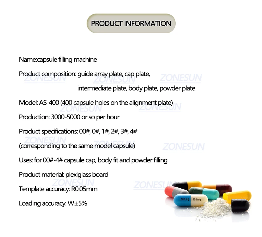 Капсулы разных диаметров, подходящие для различных типов капсульных пластин, таких как капсулы 0 #, должны быть заполнены пластинами для наполнения капсул 0 # и не могут использоваться универсально.