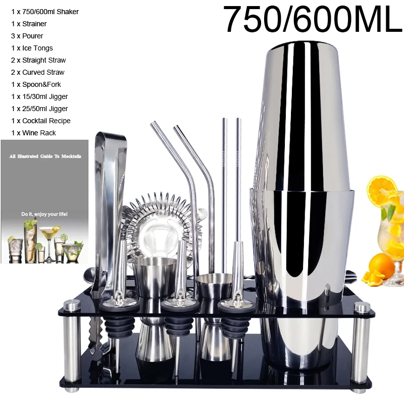Набор включает в себя необходимые для смешивания напитков, поставляется с подставкой с прорезями для удобного хранения