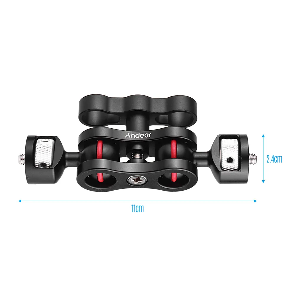 Dual ball heads with 1/4 inch screw, used as a connector for cameras, monitors, LED video light, microphone, camera cage and so on.