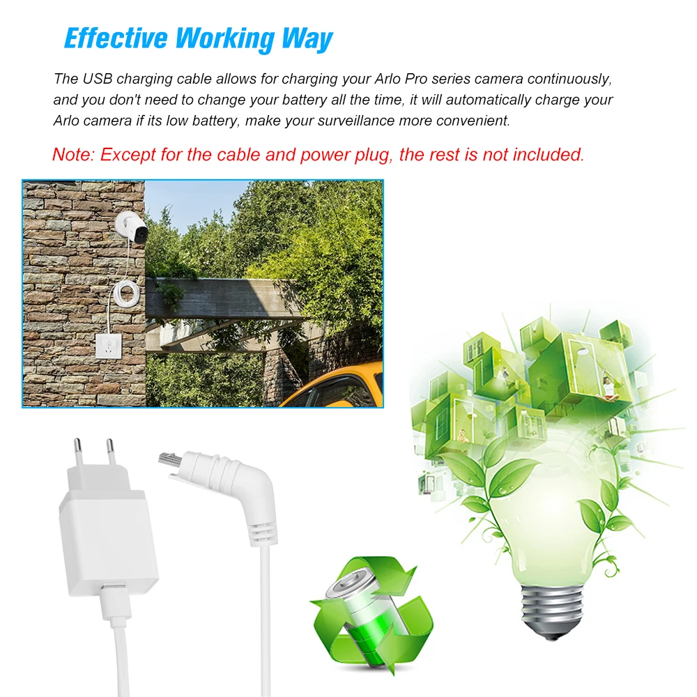 * Эффективный способ работы: usb-кабель для зарядки позволяет непрерывно заряжать камеру серии Arlo Pro, и вам не нужно постоянно менять аккумулятор, он автоматически зарядит вашу камеру Arlo, если ее низкая батарея, сделает ваше наблюдение более удобным.