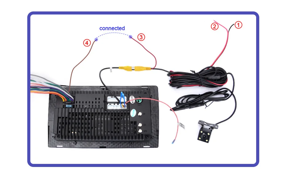 3) кабель для обнаружения заднего хода ④ (коричневый цвет) подключен к красному кабелю ③, который удлиняется от входного кабеля видео