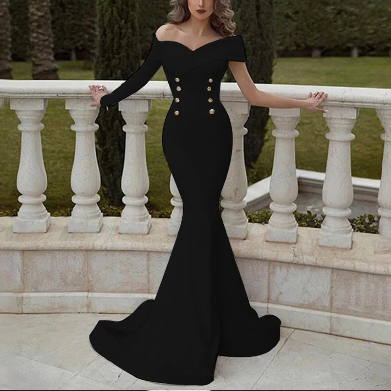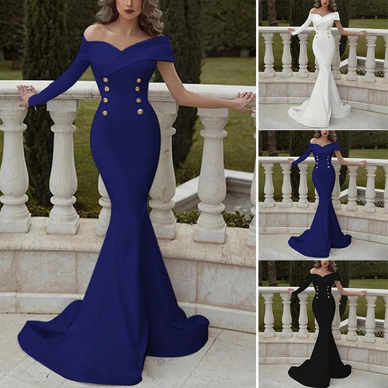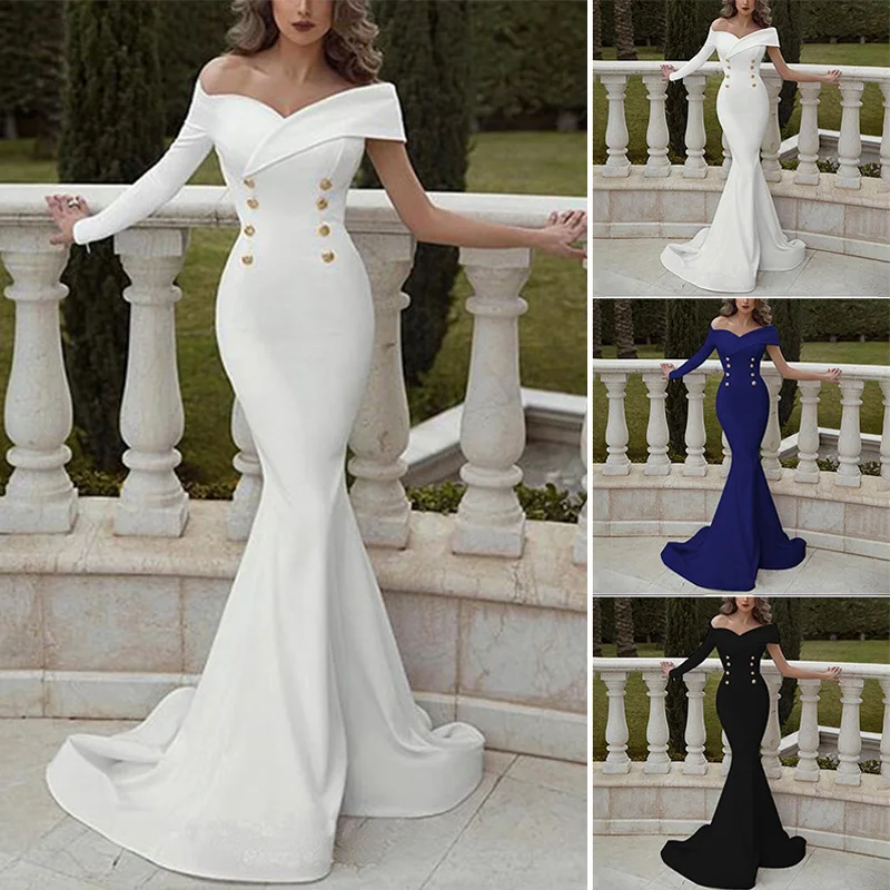 * Описание товара:Женская одежда, сексуальное тонкое, свадебное вечернее платье подружки невесты, вырез лодочкой, с открытыми плечами, элегантное банкетное платье с хвостом