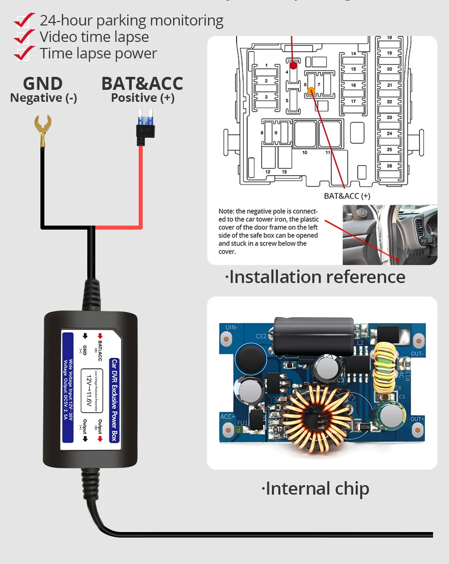 Если вы хотите остановить мониторинг после парковки (видеорегистратор не работает после парковки), подключите положительный полюс понижающей линии к интерфейсу предохранителя ACC.