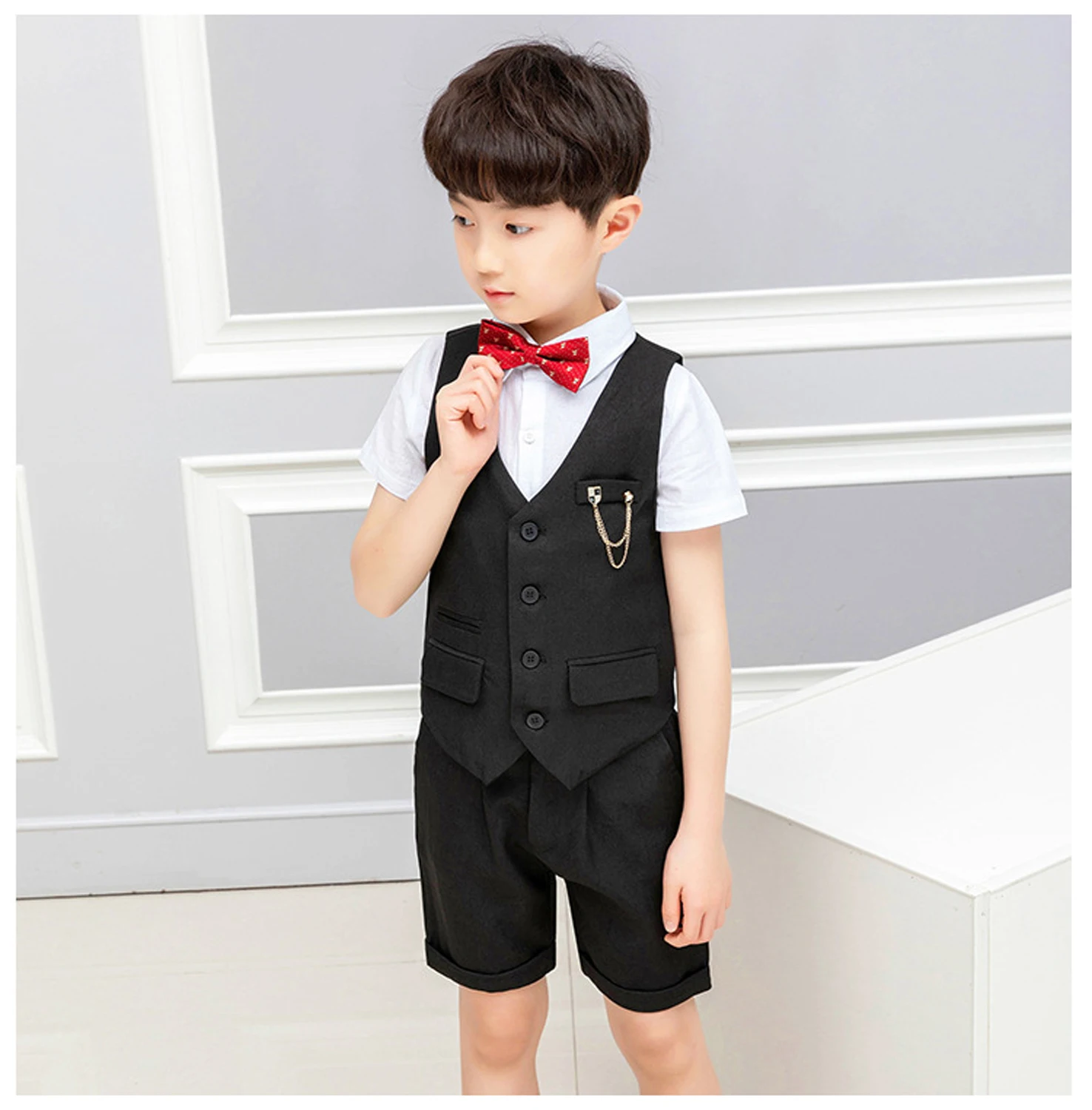 💐💐Этот костюм из 4 предметов включает белую рубашку с короткими рукавами с милым галстуком. Черный жилет и брюки аналогичного стиля. Джентльменская Одежда для маленьких мальчиков; Рубашка и брюки с жилетом; Комплекты. 💐💐Жилет с двумя накладными передними карманами и застежкой на пуговицах спереди. С золотым украшением на груди. 💐💐Брюки с 2 боковыми карманами, талией с застежкой на пуговицах спереди и с поясом сзади. 💐💐Стиль смокинга для маленьких мальчиков с галстуком делает его очень милым и формальным, выглядит более джентльменским и модным.