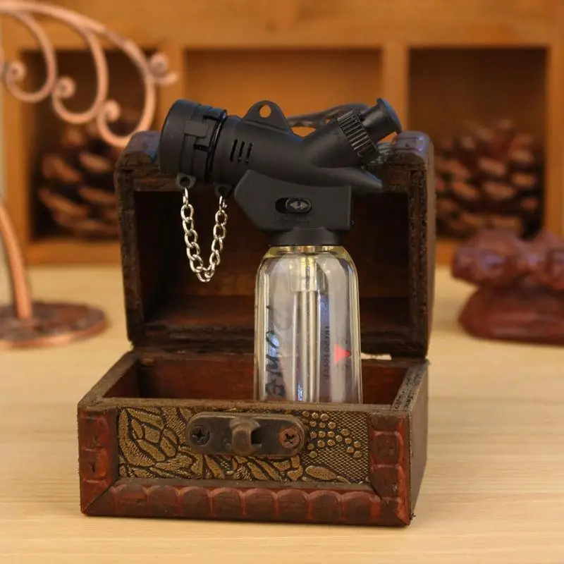 Бутановая Зажигалка открывается с защитной крышкой, которая открывается только при нажатии/включении фонарь. Зажигалка заполняется из стандартной канистры для бутановой зажигалки. Есть пламенный замок, чтобы сохранить пламя и детский замок, чтобы предотвратить нажатие кнопки зажигания.