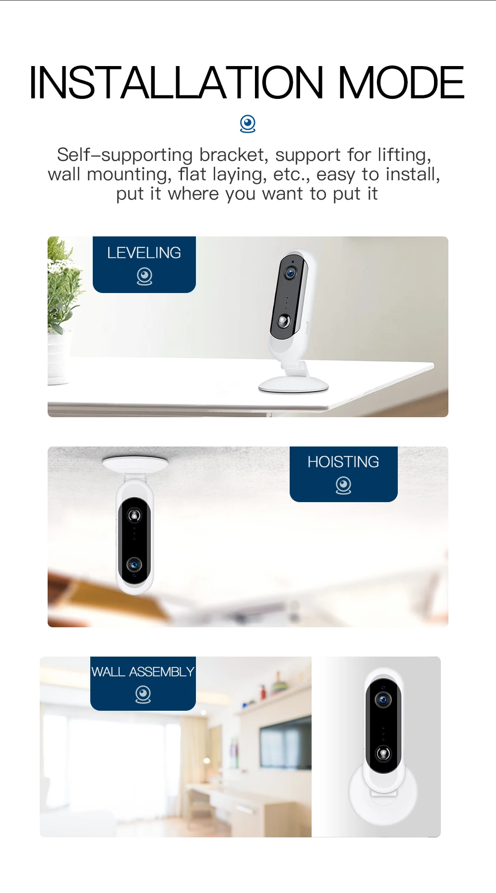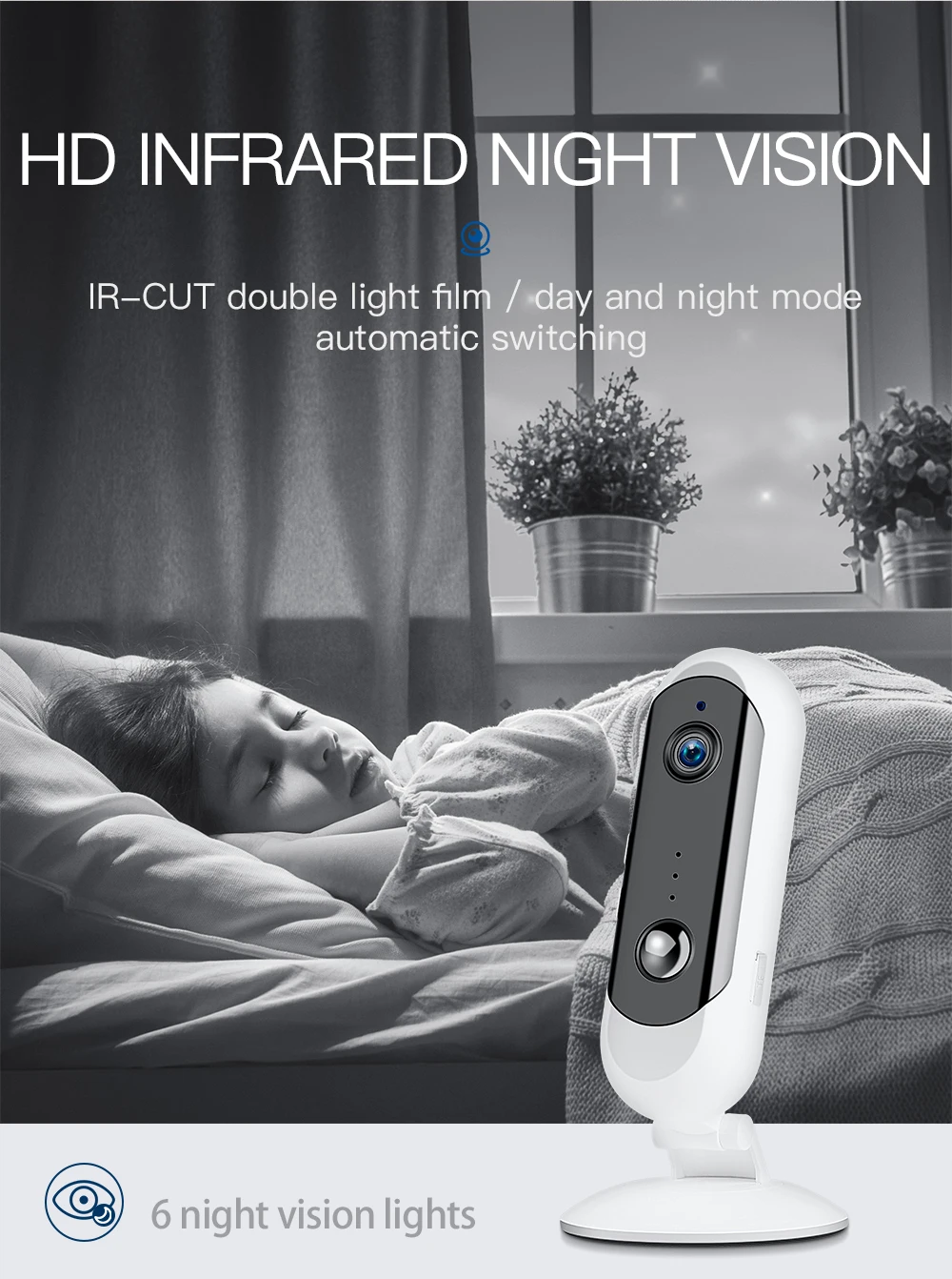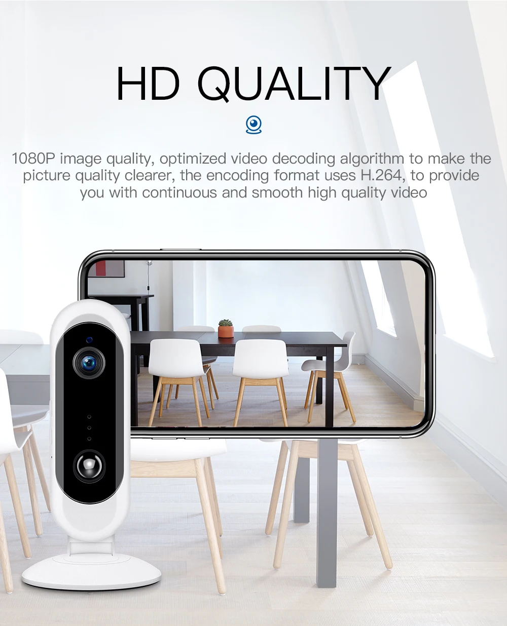 Характеристики: Разрешение: 1080P, 720P Ночное видение: инфракрасное ночное видение Память: TF карта памяти, поддержка 4-128 ГБ, (TF карта не входит в комплект, вы должны купить ее на местном рынке) Видео: ручной будильник Способ подключения: WIFI 2,4 ГГц Аудиовыход: Встроенный динамик Аудио вход: Встроенный микрофон Способ установки: вертикальная, подвесная стена, потолок Рабочая температура: от 0 до 50 градусов Источник питания: DC 5V 2A Преимущества: Обнаружение движения Смарт HD инфракрасное ночное видение Подключение Wifi Двухстороннее аудио Голосовая беседа Мобильный телефон с дистанционным управлением Мульти-платформа (Поддержка ios,android, windows) Многопользовательский (поддержка нескольких людей, чтобы смотреть онлайн одновременно) Простота установки