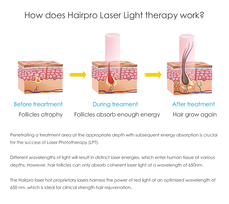 * Лазер HairPro-это носимая система роста волос, которая лечит истончение волос и восстанавливает более толстые, более полные, более сильные волосы у женщин и мужчин. Это США FDA (No. K171835) одобренный и клинически доказанный низкий уровень лазерной терапии (LLLT) или LPT-Лазерная фототерапия. Доказано, что эта технология заряжает и стимулирует волосяные фолликулы, используя светильник. * Лазерная шляпа для роста волос Hairpro включает в себя 81 шт., 5 МВт каждая, 670нм длина волны, отдельные лазеры. Эти лазеры сосредоточены в герметичном полукруговом модуле, который может быть установлен в любой тип крышки/шляпы, и питается от перезаряжаемых литиевых батарей. С таким эффективным и портативным устройством лечения, вы можете получить лечение в любое время и в любом месте, не идя в клинику.